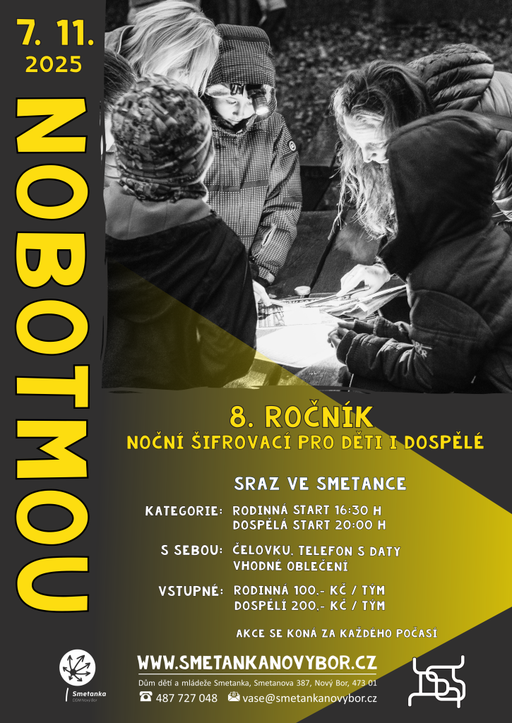 Noční šifrovací hra pro děti a dospělé. Rodinná kategorie startuje v 16:30h, dospělí ve 20:00h. Pravidla přílohou tohoto příspěvku.